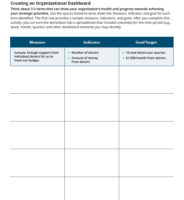 Use this worksheet to brainstorm measures, indicators, and goals that you can use to create an organizational dashboard.