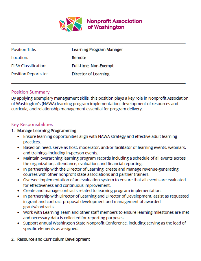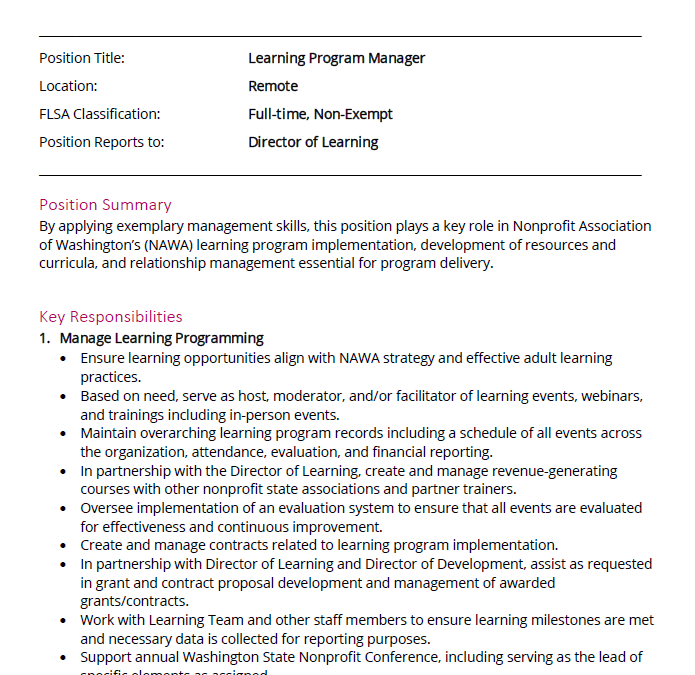 By applying exemplary management skills, this position plays a key role in Nonprofit Association of Washington’s (NAWA) learning program implementation, development of resources and curricula, and relationship management essential for program delivery.