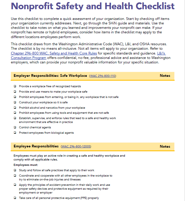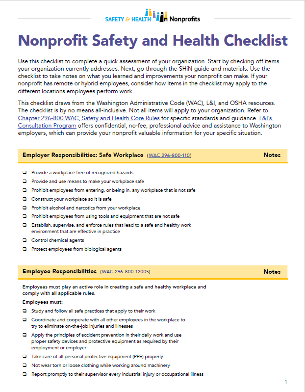 Use the Nonprofit Safety and Health Checklist to make sure your organization is on track with safety and health compliance.
