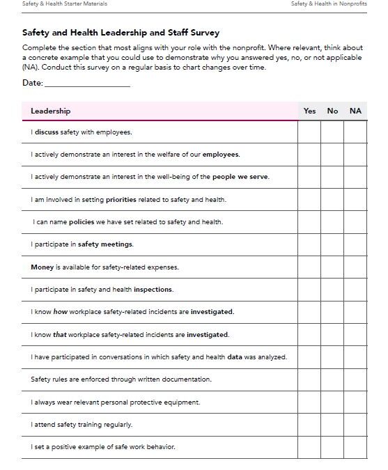 This Safety and Health Leadership and Staff Survey is one way you can evaluate the safety and health culture throughout your organization and how your systems are working.