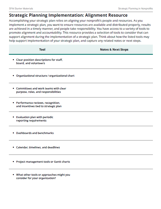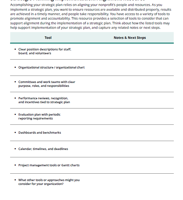 This resource provides a selection of tools to consider that can support alignment during the implementation of a strategic plan.