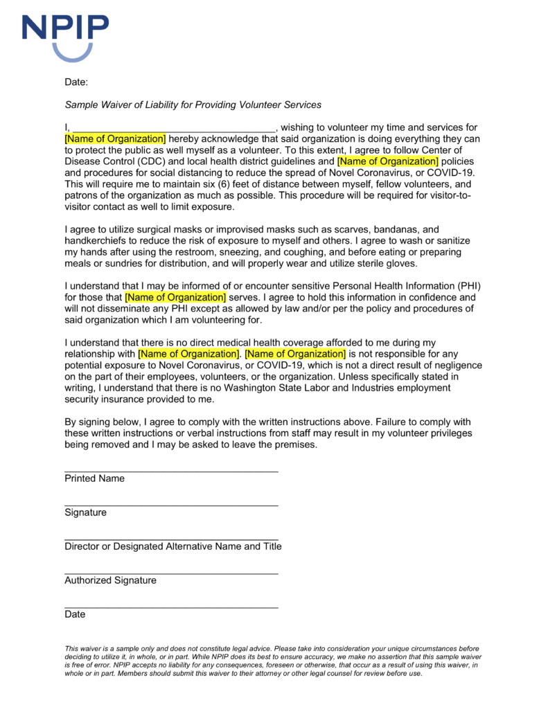 We are grateful to our partner NPIP (Non Profit Insurance Program) for sharing these model forms to help nonprofits adjust and continue to serve at this time.