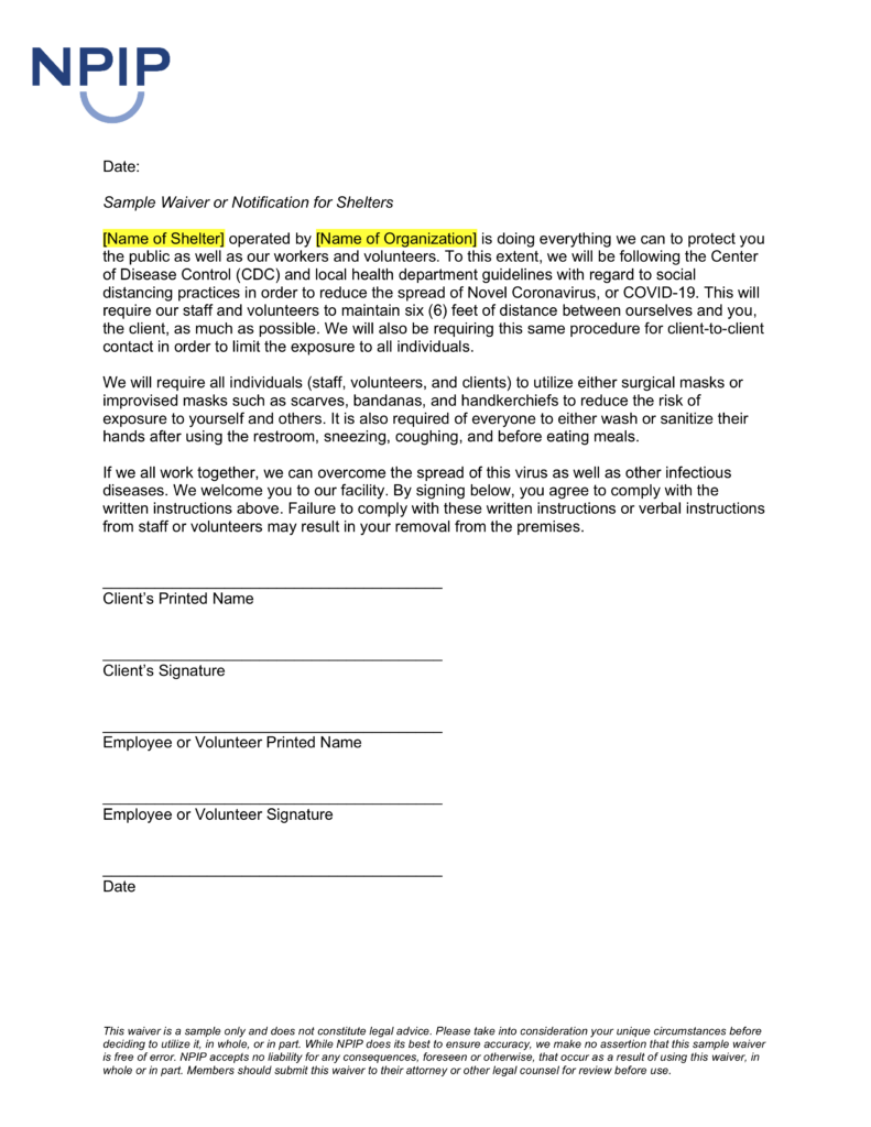 Download an editable version of the Sample Waiver or Notification for Shelters and the Sample Waiver of Liability for Providing Volunteer Services.