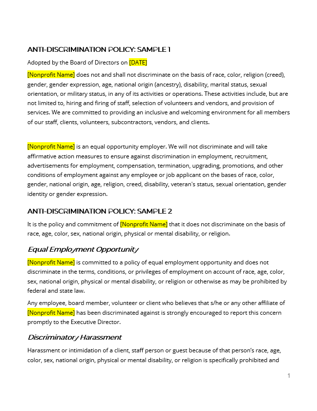 This sample anti-discrimination policy is provided as a starting place to work from if your organization does not have a policy yet.
