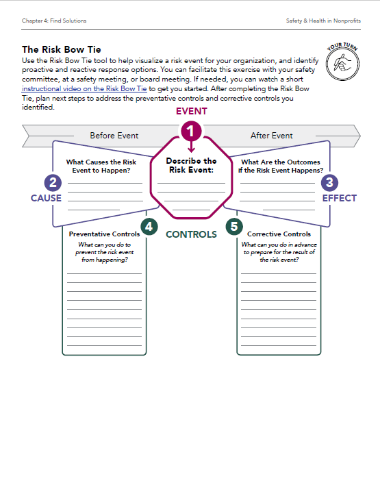 Use the Risk Bow Tie tool to help visualize a risk event for your organization, and identify proactive and reactive response options. You can facilitate this exercise with your safety committee, at a safety meeting, or board meeting. After completing the Risk Bow Tie, plan next steps to address the preventative controls and corrective controls you identified.