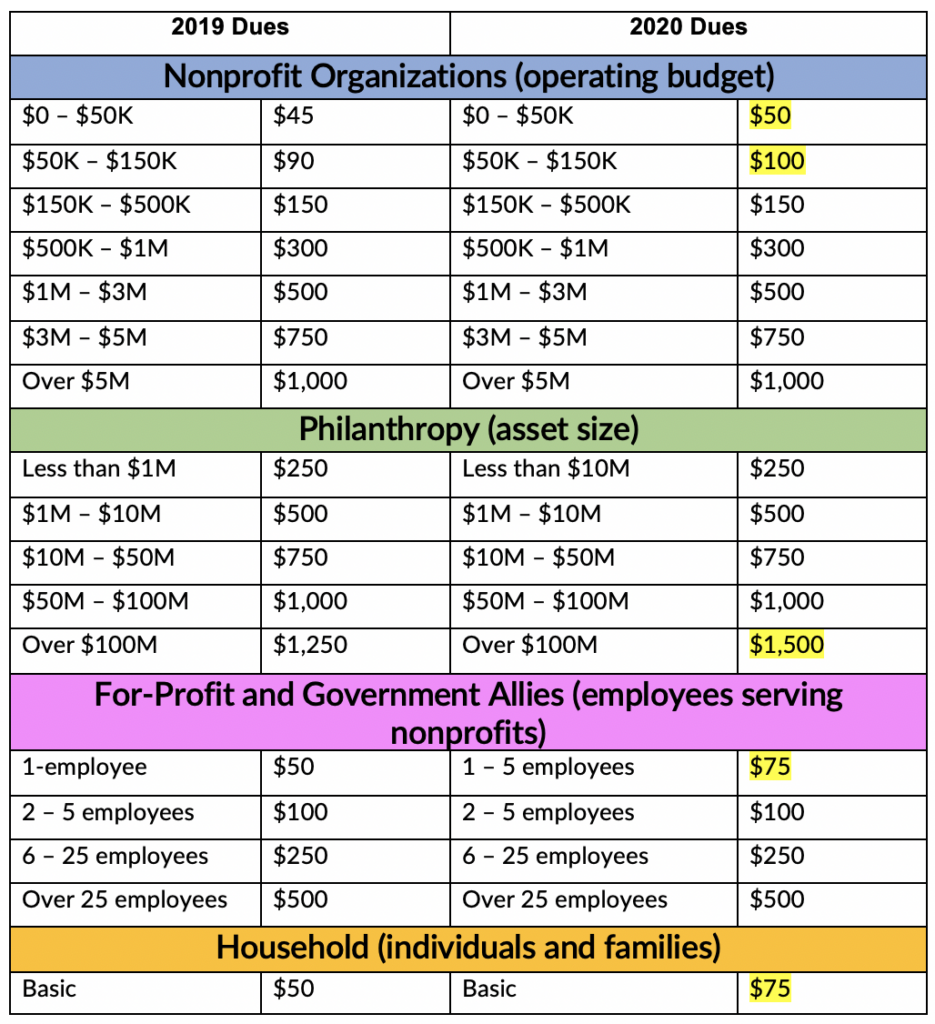 Coming in January of 2020, Washington Nonprofits membership dues will be slightly adjusted. As the nonprofit sector in Washington grows, we are updating and simplifying our membership program so it can better serve you. Membership dues will still be on a sliding scale, with dues for small nonprofits starting at $50 a year. You can see a chart below outlining those changes.